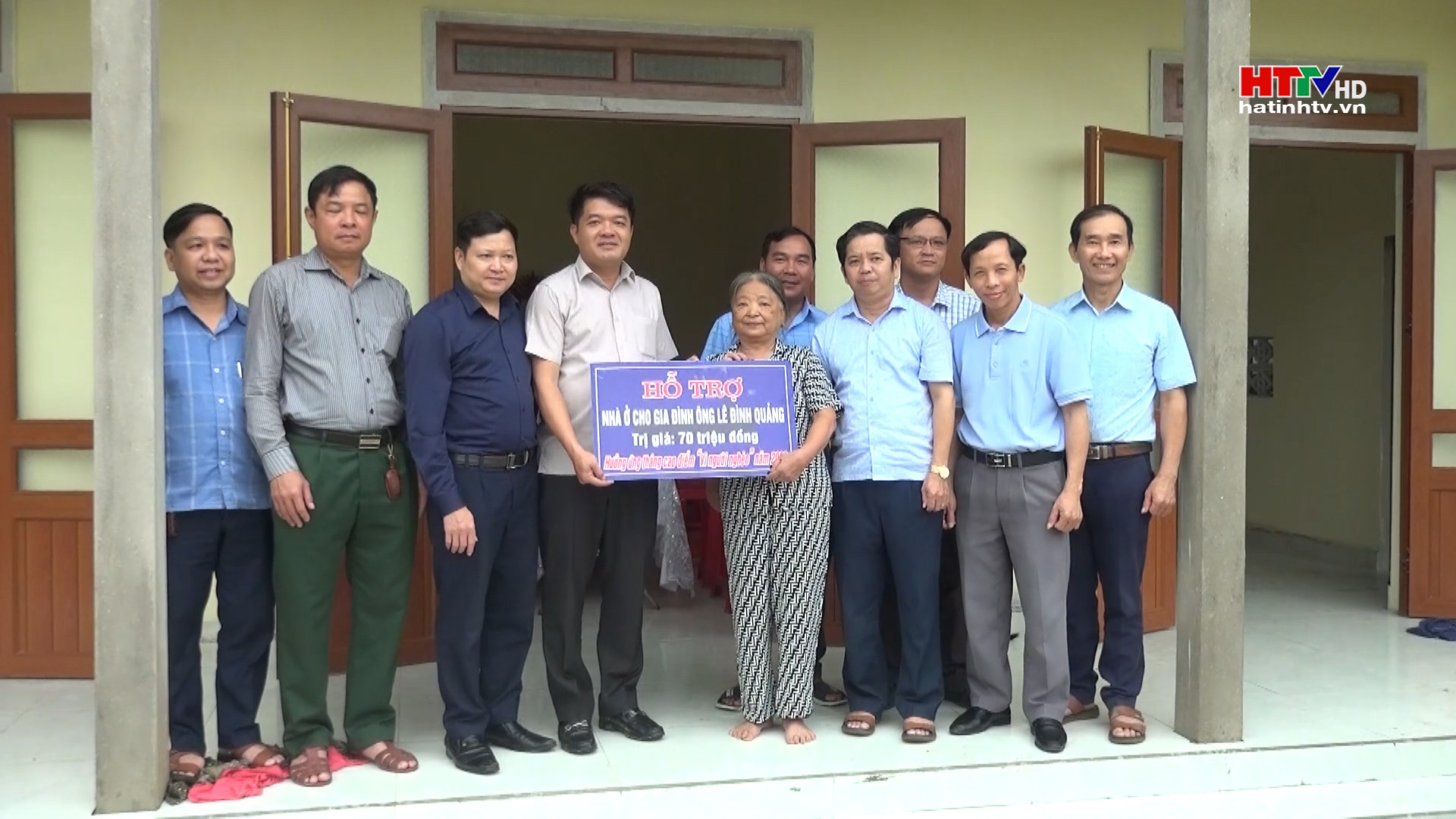 Chủ tịch UBMTTQ tỉnh Trần Nhật Tân trao tiền hỗ trợ nhân dịp khánh thành bàn giao nhà cho ông Lề Đình Quảng