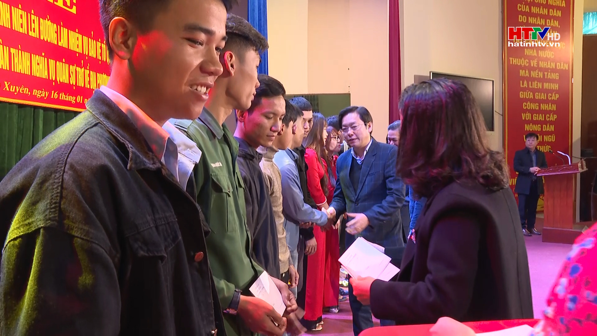 Tại buổi lễ, lãnh đạo huyện Cẩm Xuyên đã tặng hoa, quà và chúc tết các thanh niên chuẩn bị lên đường nhập ngũ và quân nhân hoàn thành nghĩa vụ quân sự trở về địa phương.