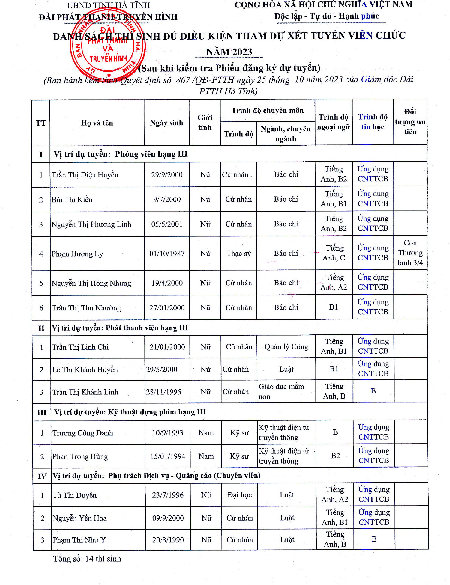 Danh sách thí sinh đủ điều kiện xét tuyển viên chức Đài PT&TH Hà Tĩnh, năm 2023