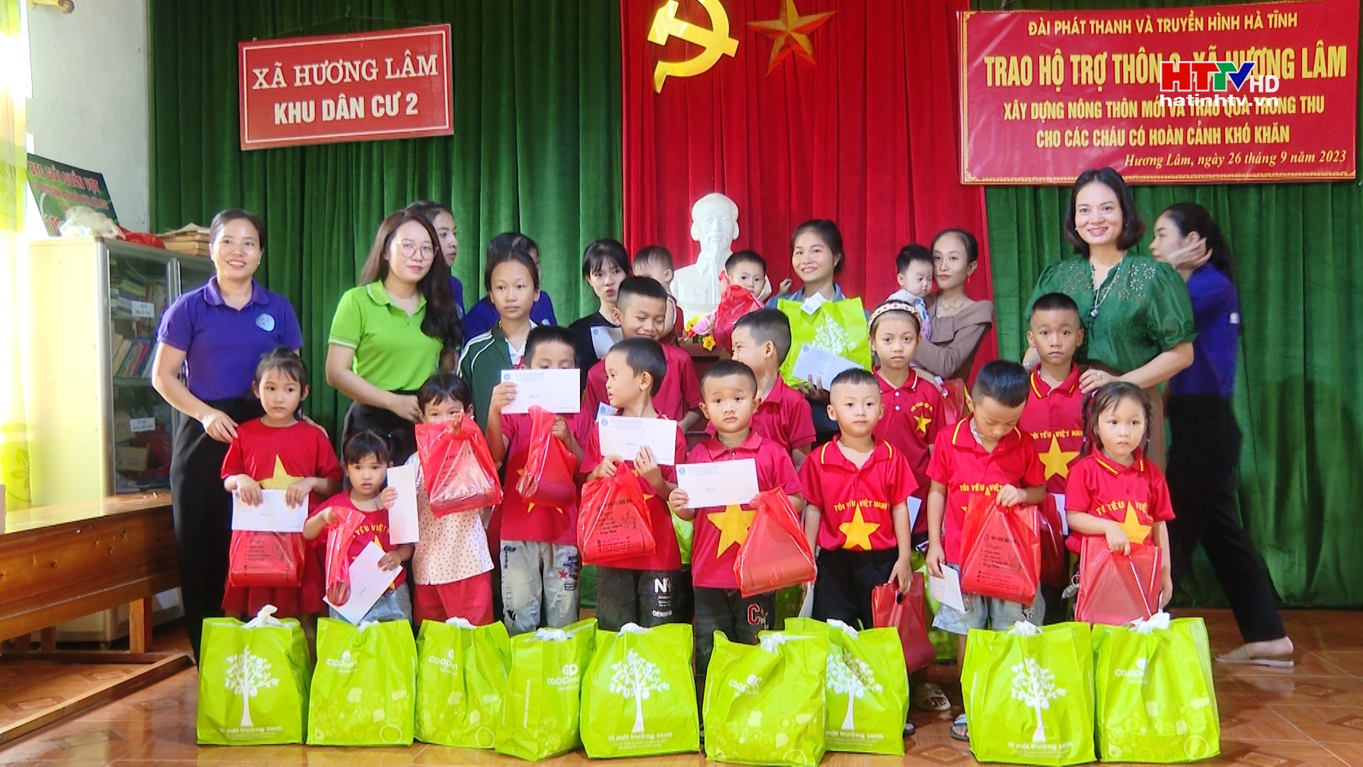 Sáng nay 29/9, Đài Phát thanh và Truyền hình Hà Tĩnh phối hợp với Câu lạc bộ Golf Doanh nhân Nghệ Tĩnh, Công ty Cổ phần Bảo Toàn, Trường Mầm non Trí Đức, Nha Khoa Mai Hùng Group, Siêu thị Co.op Mart đã đến tặng quà cho nhiều em nhỏ nhân dịp Tết Trung Thu và trao hỗ trợ xây dựng nông thôn mới tại xã Hương Lâm, huyện Hương Khê với tổng số tiền hỗ trợ là gần 120 triệu đồng.