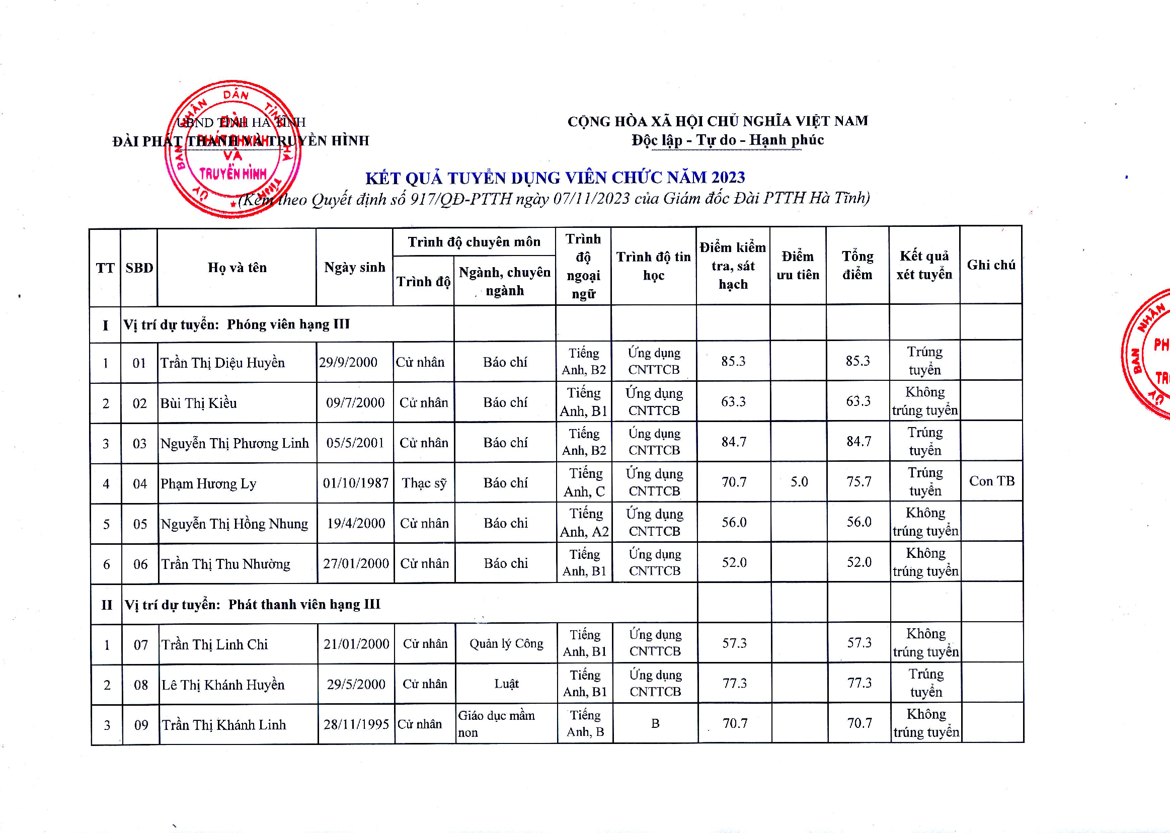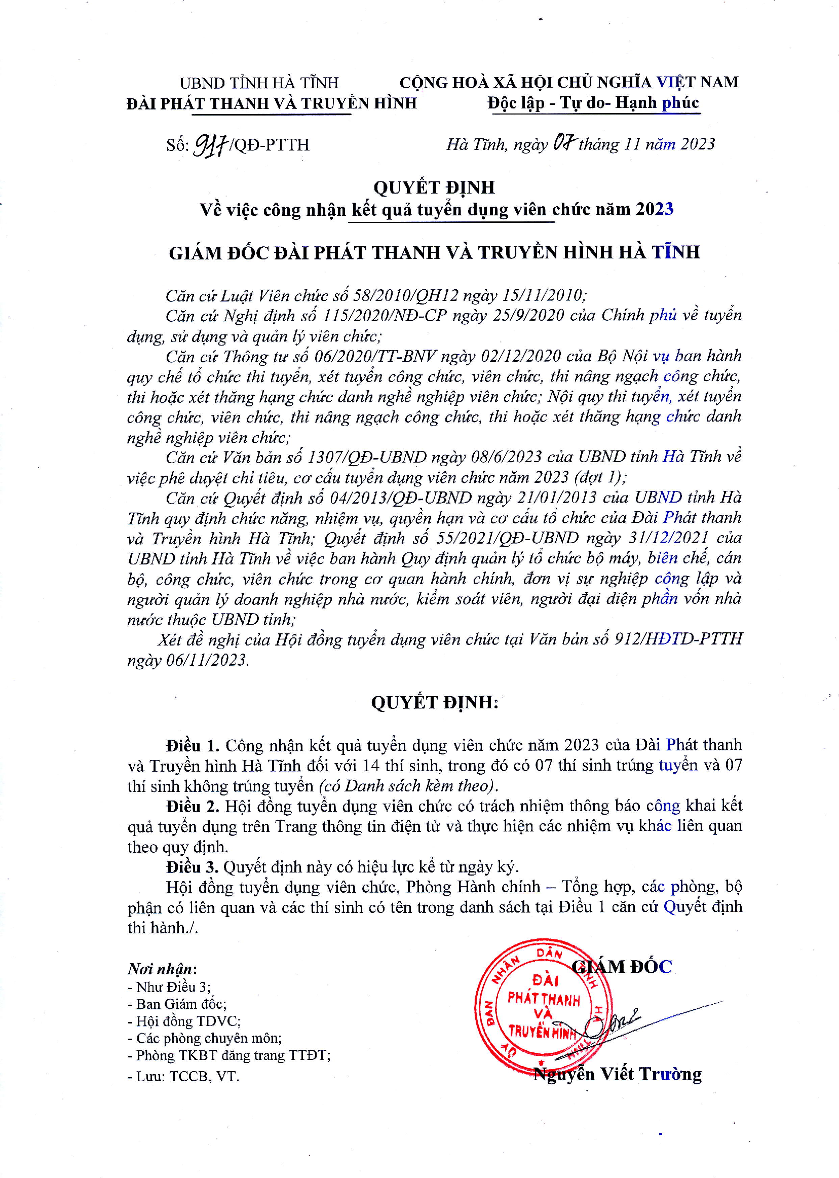 Giám đốc Đài Phát thanh - Truyền hình Hà Tĩnh vừa ban hành Quyết định công nhận kết quả tuyển dụng viên chức năm 2023. Theo đó, 7 thí sinh trúng tuyển tại kỳ thi viên chức của Đài Phát thanh và Truyền hình Hà Tĩnh.