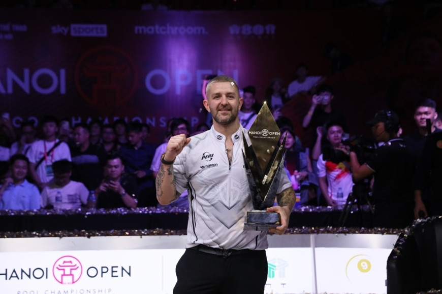 Tay cơ Jayson Shaw nâng cúp vô địch Hanoi Open Pool Championship 2023. Ảnh: VIỆT TRUNG