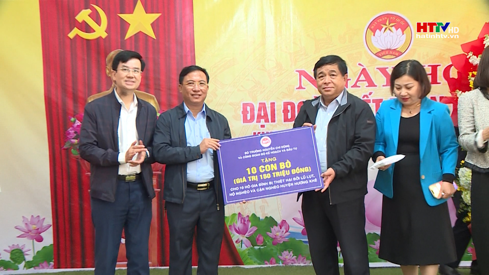 Nhân dịp này, Bộ trưởng Bộ Kế hoạch và Đầu tư đã trao tặng máy phát điện cho thôn Trung Tiến; trao biểu trưng tặng 10 con bò trị giá 150 triệu đồng cho các hộ nghèo, hộ hoàn cảnh khó khăn bị ảnh hưởng bởi lũ lụt tại huyện Hương Khê và tặng quà cho một số hộ dân trên địa bàn.