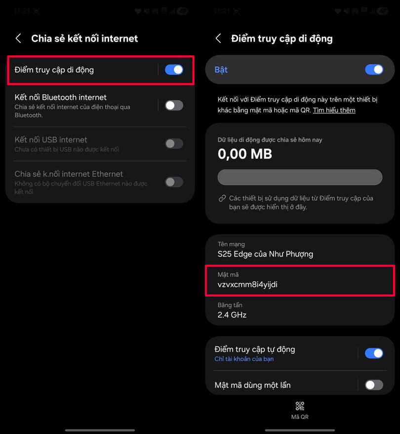 Kiểm tra lại bạn đã bật điểm truy cập di động hay chưa: Nếu mục điểm truy cập chưa bật, điện thoại có thể không cho phép chỉnh sửa mật khẩu. Hãy bật Điểm truy cập di động lên trước rồi thử đổi lại.