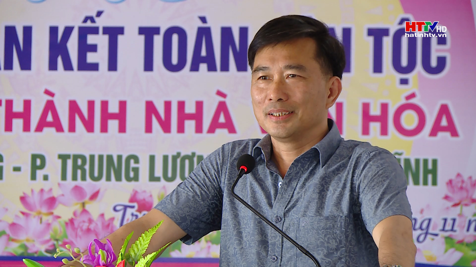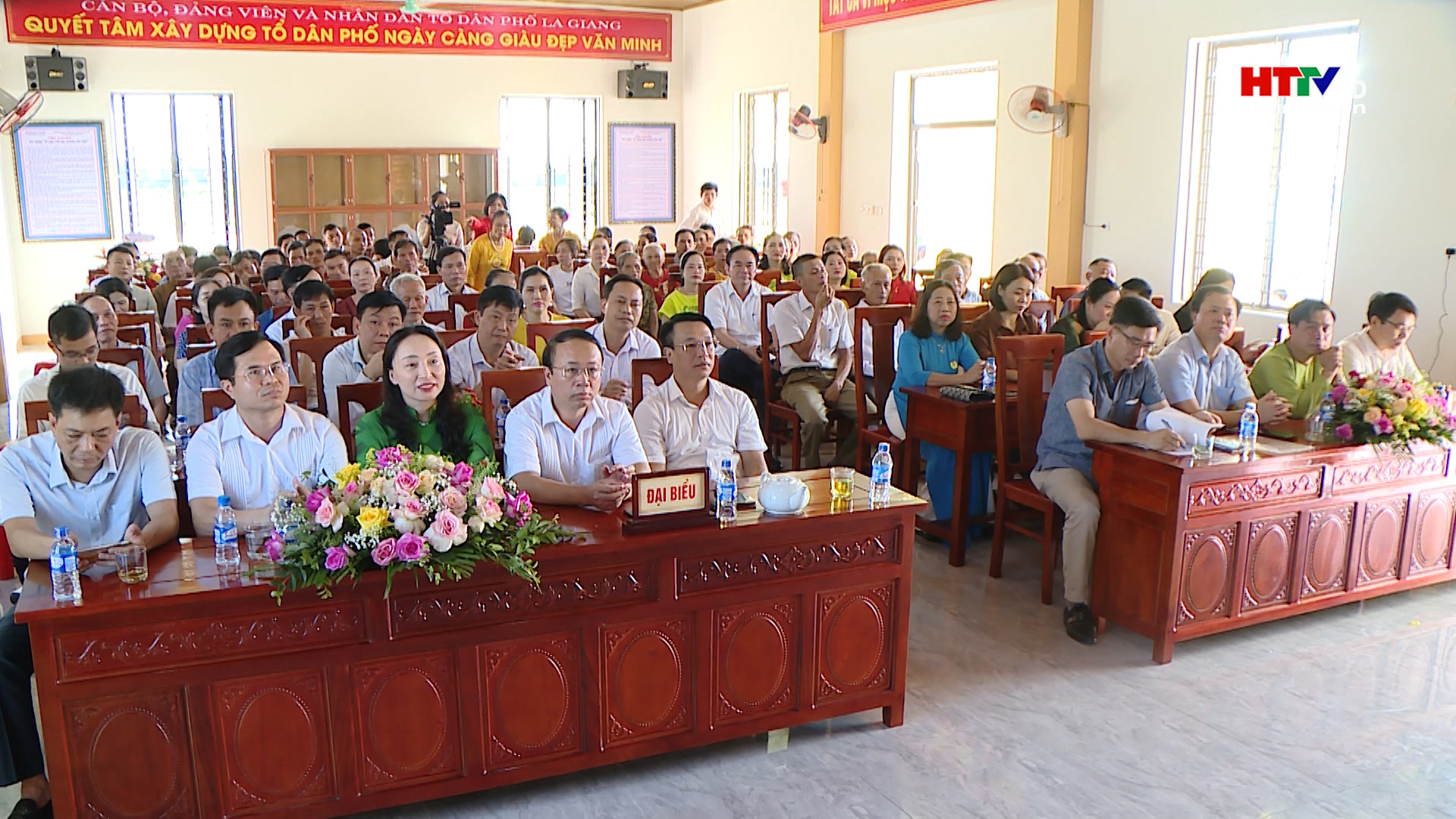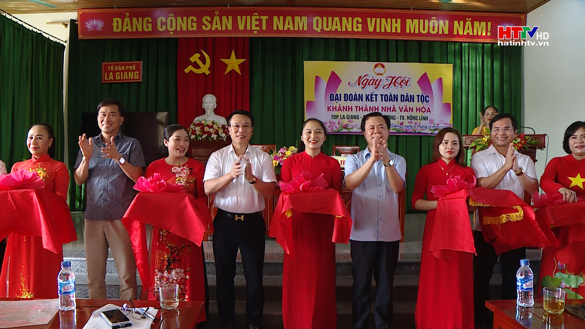 Giám đốc Đài PT&TH Hà Tĩnh và lãnh đạo thị xã Hồng Lĩnh tặng hoa chúc mừng Nhân dân tổ dân phố La Giang nhân Ngày Đại đoàn kết