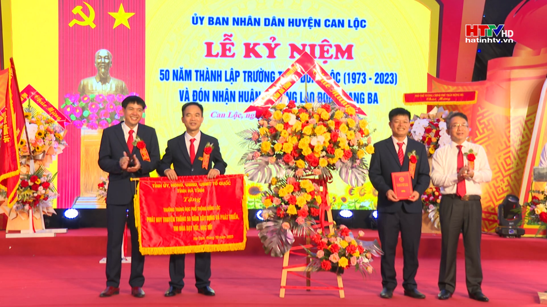 Tỉnh uỷ, HĐND, UBND, UBMTTQ tỉnh tặng trường THPT Đồng Lộc bức trướng với dòng chữ “Phát huy truyền thống 50 năm xây dựng và phát triển, thi đua dạy tốt, học tốt”./ .
